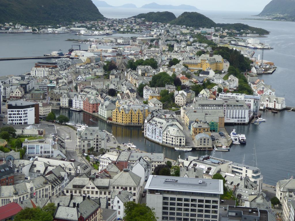Wir fuhren heute nach Alesund, wo wir am frühen Nachmittag eintraffen und auch übernachten. Auf einem Parkplatz, speziell für Wohnmobile, mit schönem Blick aufs Meer. In Alesund sind im Gegensatz zu den meisten norwegischen “Landstädtchen” in denen praktisch nur Holzhäuser sind fast alle Gebäude aus Stein. dies ist auf einen Brand 1904 zurüch zu führen, bei dem fast die ganze Stadt abgebrannt war, danach wurde ein Gesetz erlassen, dass nur Steinhäuser gebaut werden dürfen. So ist also Alesund eine untypische aber sehr hübsche Stadt geworden. Vom Hausberg hat man eine sehr schöne Sicht auf die Stadt, den Berg kann man zu Fuss erklimmen, über 400 steile Stufen, wir sind lieber hochgefahren.